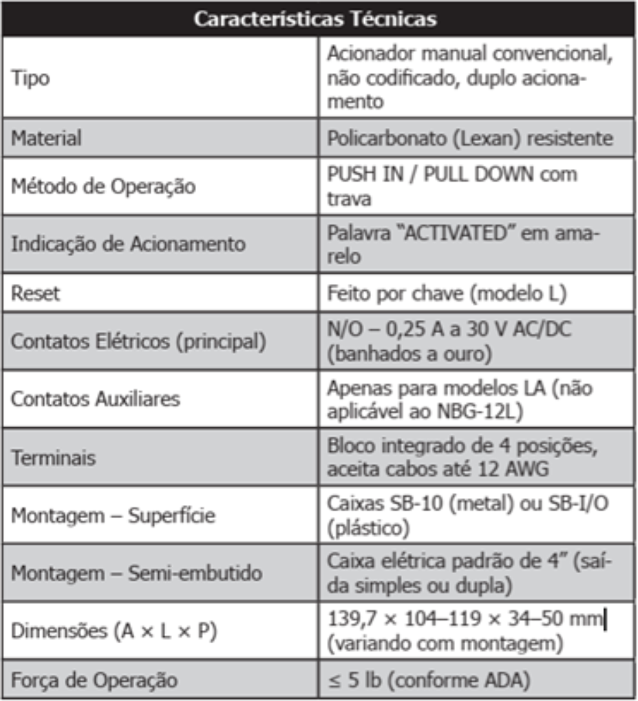 O NBG-12L é um acionador manual de alarme de incêndio convencional e de duplo acionamento, feito em policarbonato vermelho de alta resistência. Opera pelo movimento PUSH IN / PULL DOWN, permanecendo travado e exibindo “ACTIVATED” após o disparo. Possui comandos em braile, operação intuitiva e design robusto para evitar acionamentos acidentais. Permite inspeção sem iniciar alarme e só pode ser resetado com chave, garantindo segurança. Seu bloco de terminais integrado facilita a instalação em superfície ou semi-embutido, atendendo aplicações comerciais, industriais e institucionais. -
